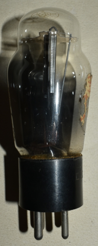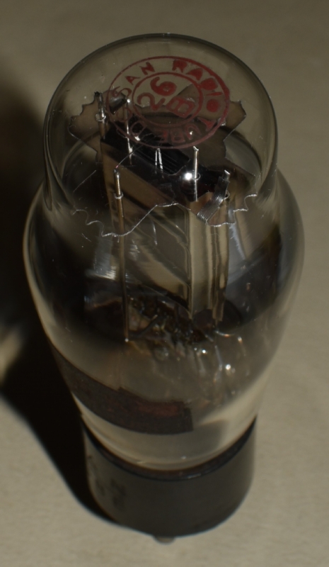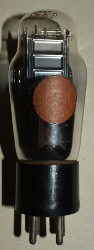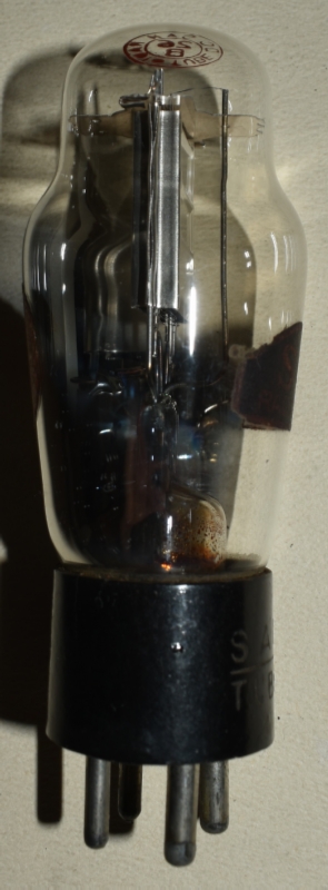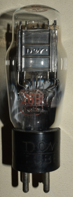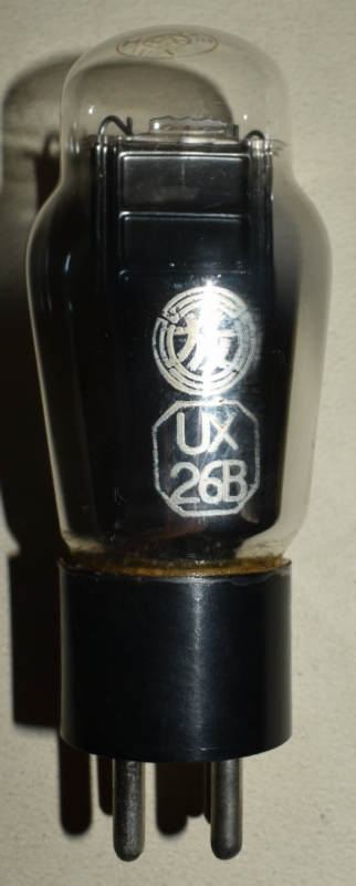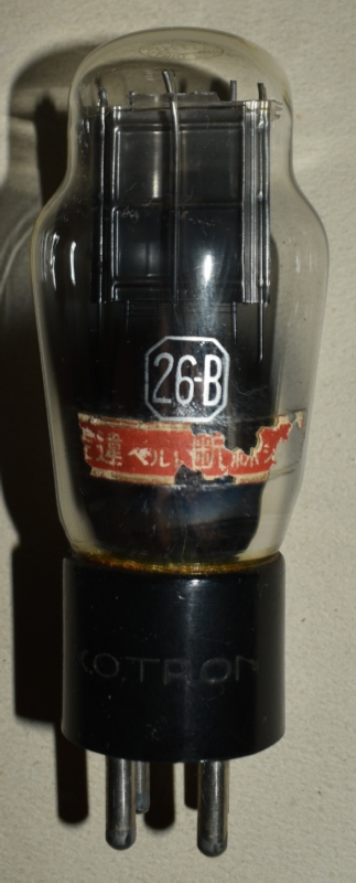 赤刻印タイプ。UX-12AやKX-12B(12F)も同じUXベース(ただし、フィラメント電圧が、UX-26Bでは1.5Vなのに対して、UX-12AやKX-12B(12F)では5V)なので、誤挿入によるフィラメント断線事故が多かったと見えて、「ソケットに注意 挿違へると断線します」と管壁に注意喚起ラベルが貼ってある。注意喚起ラベルは、下の、エレバムやKOトロンの球にも貼られている。また、ドンのUX-26にも同様の誤挿入注意喚起ラベルが貼られている。