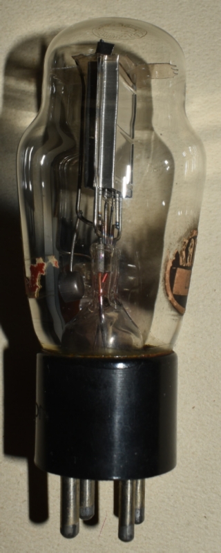 刻印ベース。管壁には、SANのラベルが貼られている。反対側には、東京真空管工業組合統制証のオレンジのラベルが貼られている。