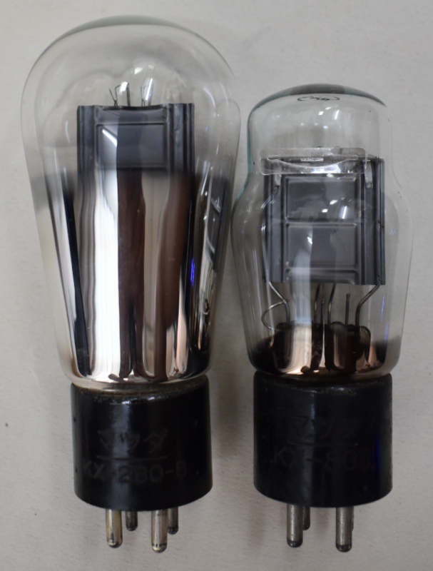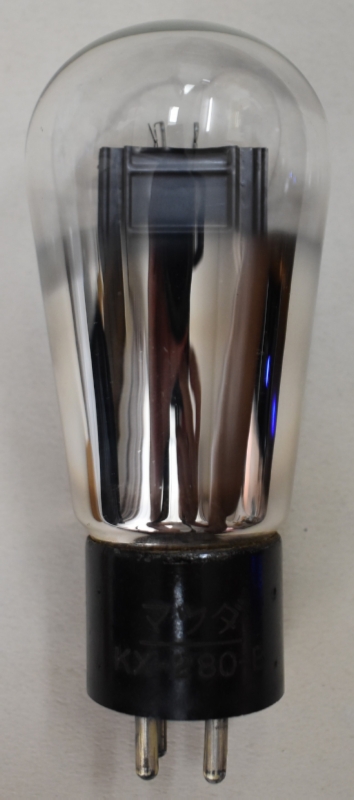 「無線と実験」昭和7(1932)年6月号の「新製品紹介」(p.388)では、「新眞空管続々生まる−エレバムが新型強力整流管112Cを製作販売したことは既報の通りであるが、其後、各製作所でも112Cを作り、最近ではサイモトロンで有名な東京電気までが眞似をして、280Bといふのを作った。280といふから両波整流と思いきや、片波整流の強力球即ち112Cの眞似だとは、さてさて大會社の面目とはつらいもの。」ともある。これだと、KX-280Bは、KX-112Cを真似て東京電気が開発した球ということになる。