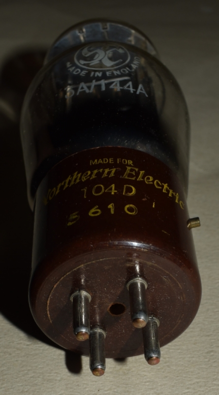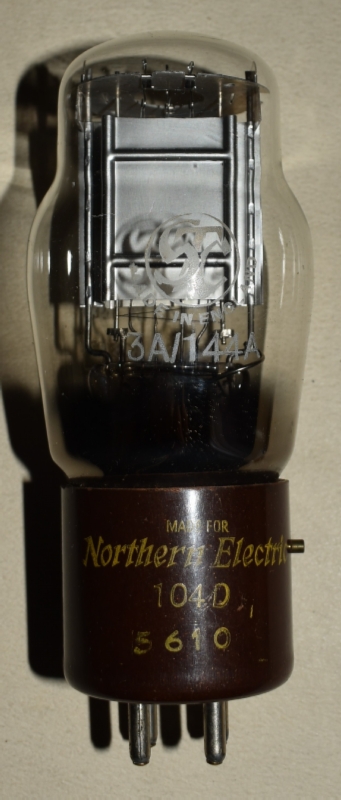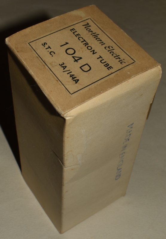 管壁には、STCのマークと管名"3A/144A"が焼き付けられており、茶色のベースには、MADE FOR Northern Electric 104Dと金色でプリントされている。角型のニッケルプレートが美しい。