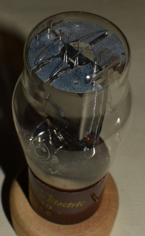 トップからの眺め。円形のトップマイカとサイドマイカと2本吊りのフィラメントが見える。構造的には、上のNEC 104Dと瓜二つだが、フィラメントが細いので区別できる。