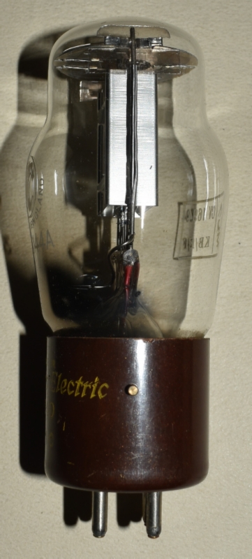 テニスボール型の中でも後期型のベークライトベースタイプ。管名とパテントの年月日が管壁にエッチングされている。ニッケル製のプレートは典型的な板極型。1本のガラス棒で保持している。足ピンは標準UV型。ピンの先端に金チップが付いている。
